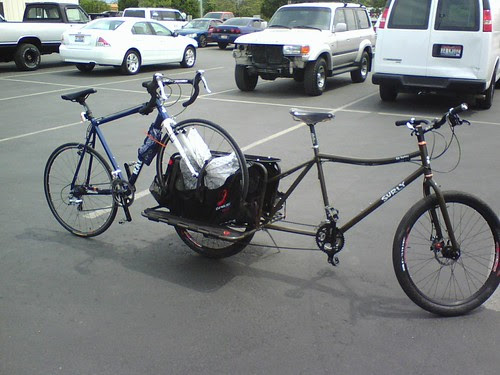 I left my Raleigh Rx1.0 at work over the weekend and needed to get it home tonight so I secured it to the side of Dummy and made it home without any problems. I ended up using a grande zip tie around the down tube and front rim of the Raleigh to keep the chain ring from chewing up the left Wideloader if I made any sharp turns. I think if I transported other bikes more often I would invest in a Traybien.